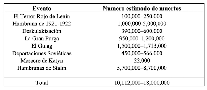 En síntesis, los números de muertos por dichos motivos y ocasionados por la URSS oscilan entre los 10 millones de muertos y los 18 millones aproximadamente (aunque debemos reconocer que jamás sabremos con exactitud la magnitud del daño y muerte que ocasionó la Unión Soviética). Este cálculo se puede ver en la figura abajo: