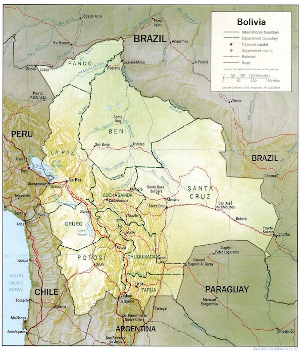 Bolivia está compuesta, grosso modo, por dos mundos, el andino y el oriental. El primero corre de norte a sur sobre las tres principales cordilleras que atraviesan Bolivia –paralelas y adyacentes a la frontera con Chile-, e incluye los departamentos de Pando, La Paz, Beni, Cochabamba, Oruro, Potosí y Chuquisaca, conformando el paisaje geográfico, humano y cultural que para nosotros es lo propiamente boliviano; el segundo, oriente, es la provincia de Santa Cruz y en parte Chuquisaca y Tarija, que no están en nuestro mapa mental ni cultural.