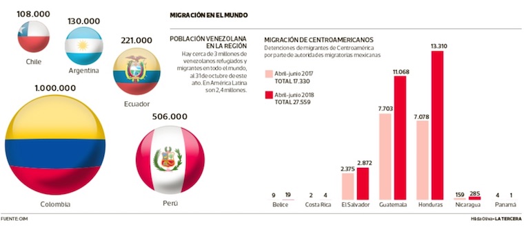 La cifra de migrantes en el mundo ha sido particularmente alta en los últimos años según demuestran los datos de Naciones Unidas, desde la crisis de refugiados en Europa en 2015. El año pasado, había 258 millones de migrantes en el mundo, un 3,4% de la población. En 2010 esa cifra llegaba a los 220 millones. Los desafíos y consecuencias de este fenómeno, que cada vez amplía más sus horizontes, están a la vista con las masivas caravanas de migrantes centroamericanos que buscan llegar a Estados Unidos, y los venezolanos que siguen huyendo en masa de su país.